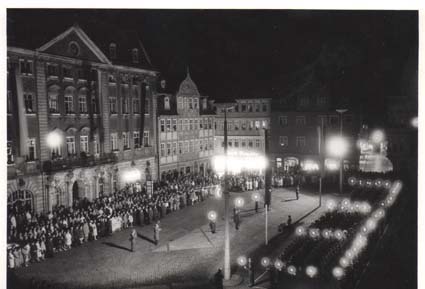 Parade auf dem Schloßplatz zwischen Ehrenburg und Theater anläßlich des jährlichen Volkstrauertages mit Kranzniederlegung am Ehrenmal in den Arkaden. Die Aufnahme wurde 1958 aufgenommen. Später fand die Kranzniederlegung ohne BGS auf dem Friedhof statt, vermutlich wegen der Störungen durch die "Weiße Rose" und sonstiger Krawallern. Im Hintergrund das Denkmal von Herzog Ernst II. In der Warner-Barracks Bamberg
